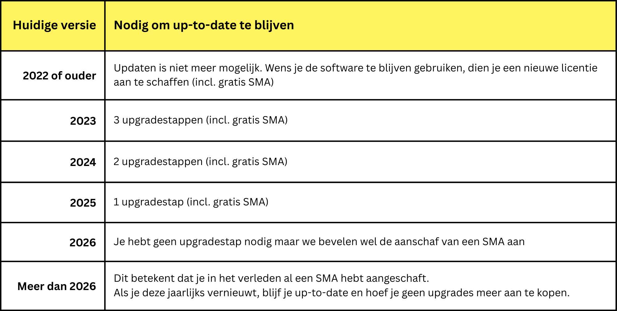 Bij je eerstvolgende aankoop in 2026 van een nieuwe licentie of een upgrade, bieden wij de SMA bij wijze van overgangsmaatregel GRATIS is.