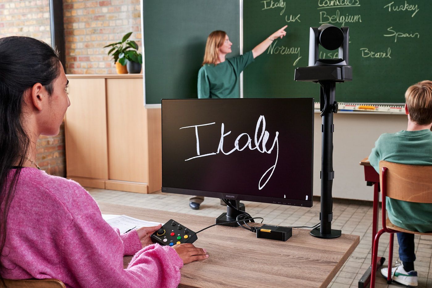 - Het beeld dat wordt vastgelegd door de gemotoriseerde camera, wordt via een ontvanger doorgestuurd naar een scherm dat zit dicht bij de leerling.